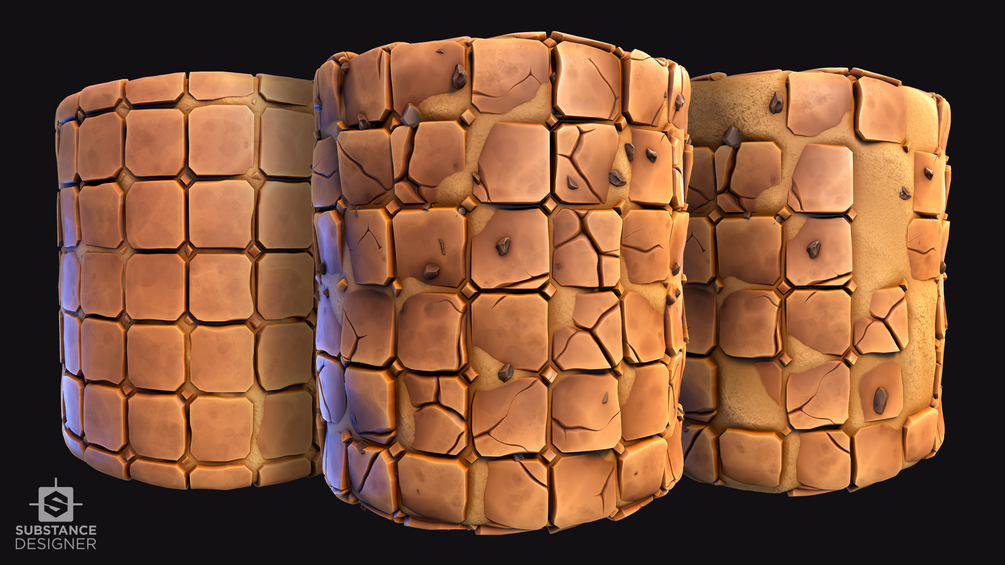 Stylized Desert Tiles I created in substance designer and rendered in Marmoset. 100% Substance Designer. These tiles were inspired/based off of a material made by Michael Vicente. There are tons of parameters that are exposed and you are able to edit, however if there is something more you'd like to see let me know!